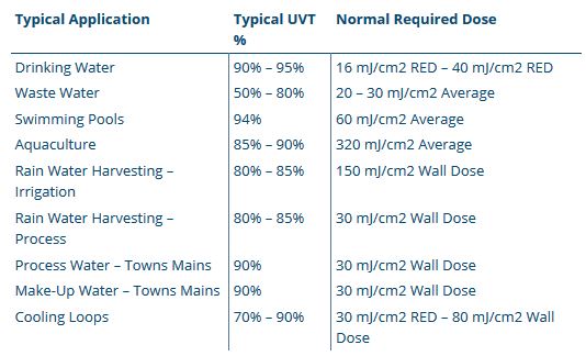 If the water is low quality, e.g. river water, the UVT will be low – around 80% UVT, requiring additional power or additional UV lamps to achieve the same UV dose performance. It is important to note that a fall in just a few % UVT can double the amount of UV intensity required to provide disinfection.