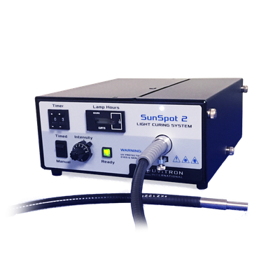 The SunSpot’s new 200W lamp delivers the highest intensity in the industry. With its 18+ W/cm2 UVA and > 30W/cm2 output from 300–550nm, the system maximizes curing speed and is compatible with high-speed production automation equipment. This high intensity also makes the SunSpot 2 ideal for use with multi-pole light guides for simultaneous light delivery to two, three or four curing zones, eliminating the need for multiple lamp systems. The system ships complete with a high output long life 5mm x 1m liquid light guide.
