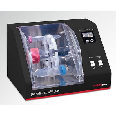 The UVP Minidizer Oven is a cost-effective device with low space requirements for temperature incubation of membranes during blotting procedures. The Minidizer operates with a state-of-the-art microprocessor as well as temperature and variable speed controls. The instrument enables consistent saturation of samples, whether it for washing or hybridizing.