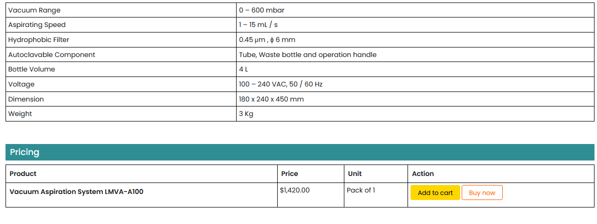 Vacuum Aspiration System LMVA-A100 Provides vacuum range of 0- 600 mbar. It provides adjustable aspirating speed range of 1 to 15 mL/s. Equipped with overflow prevention sensor to stop spillage during operation. It includes autoclavable components of tube, waste bottle, and operation handle. Our Vacuum Aspiration System Easily switch between single-channel and multi-channel configurations for diverse applications.