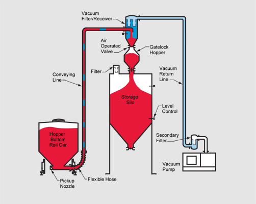 The material is fed into the conveying line on a continuous basis by vacuum which is supplied by a high pressure vacuum pump. The system includes a vacuum pickup nozzle, a vacuum conveying line, a vacuum/filter receiver, a secondary filter and a vacuum pump. For continuous conveying applications, a gatelock hopper with an inlet and outlet valve is installed at the discharge of the vacuum receiver.