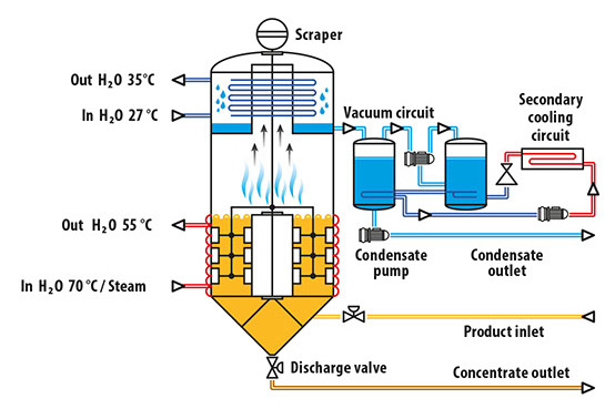 Among the vacuum evaporators/concentrators that exploit thermal energy powered by hot water or steam (or diathermic oil) during the first evaporation stage, the ETR W model has been developed to obtain more concentrated waste and to treat encrusting solutions. The employment of an automatic scraper, that keeps the exchange surfaces of the vertical tank clean, allows to obtain thicker concentrates than the ones got through other evaporation systems. The concentrate can be discharged either with a membrane pump or through a butterfly valve.