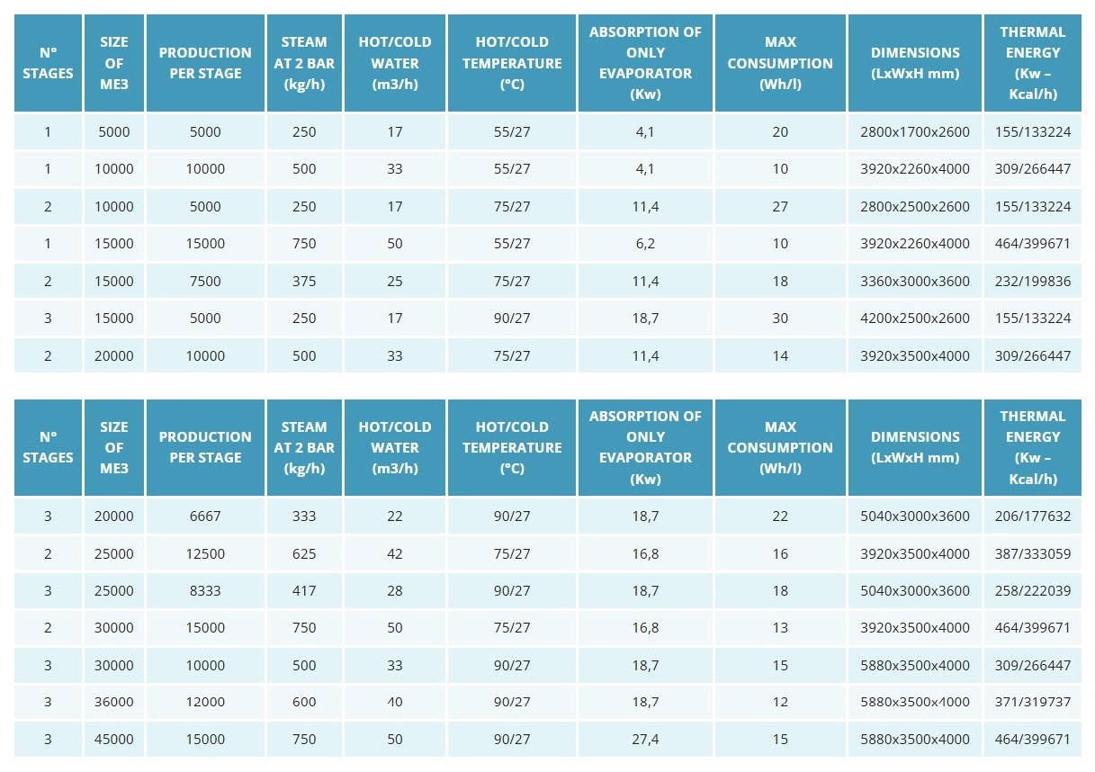 Energy saving and Large Volumes. Alternative energy sources (including methane, GPL, steam, olive residues) can be used to produce hot water or steam as a source of energy for the ME Multiple Effect series. Volumes processed 10,000 β 50,000 lt/day.