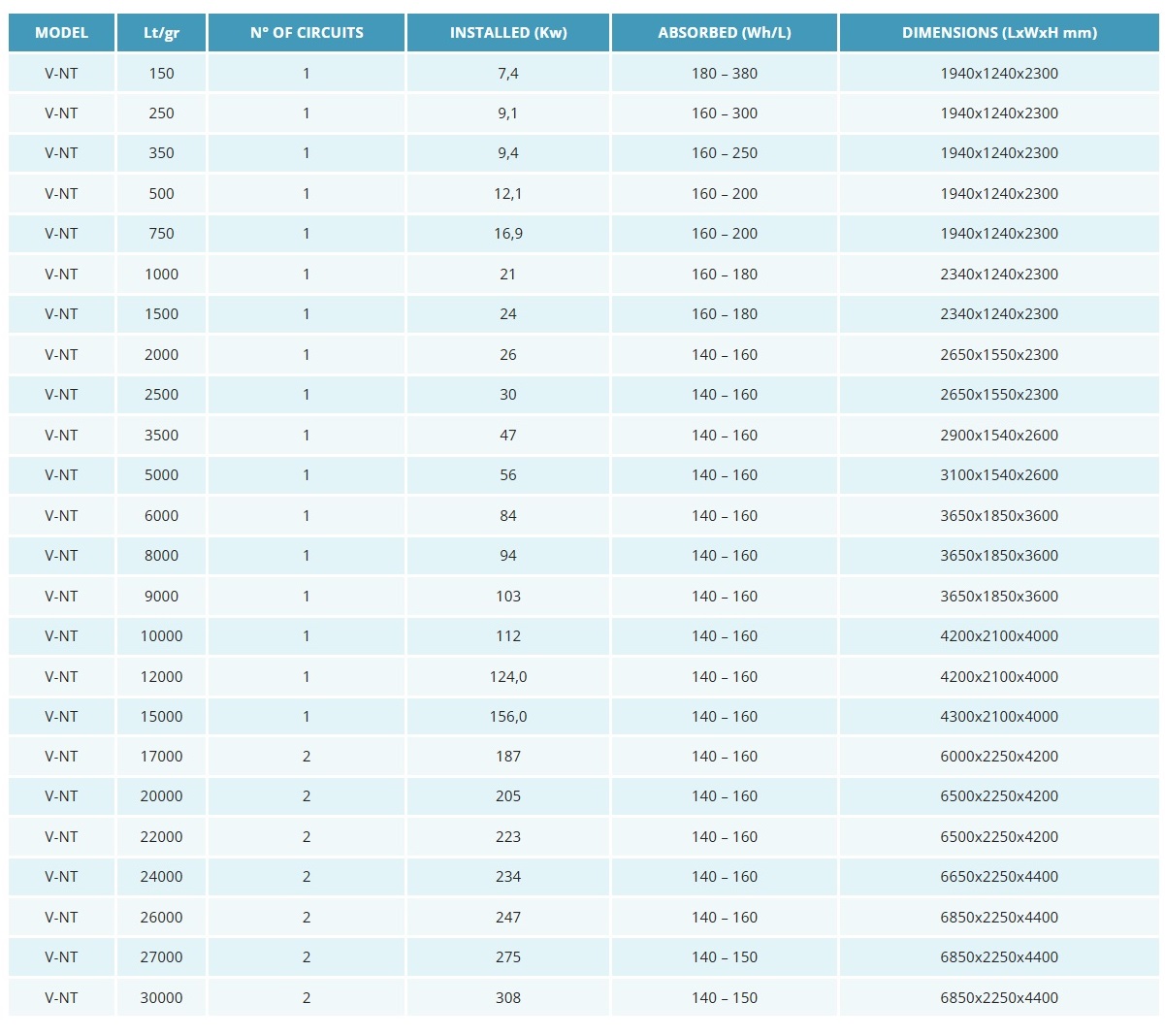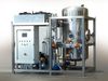 High quality condensate. Energy consumption is reduced to a minimum by using a heat pump in a vacuum. With an absolute pressure of ≈ 33 mbar in the boiling chamber, evaporations occurs at very low temperatures (≈ 35 ºC). Volumes treated 150 – 30,000 litres/day. Volumes processed 150 – 30,000 lt/day.