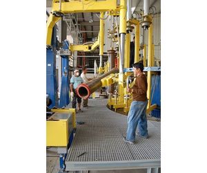 Pipe is collected from a polyurethane processing assembly (socket/ spigot sealing) and transported via a pneumatically assisted vacuum pipe lifting manipulator too a conveyor band. The ergonomic and easy to operate vacuum pipe manipulator deletes the requirement to lift pipe by hand. The Schoenbeck manipulators can manoeuvre pipe in just about any position you require. Complete rotation (clockwise or anticlockwise), push button functions for lift/ elevate or lower, suction on, suction release and emergency stop.
