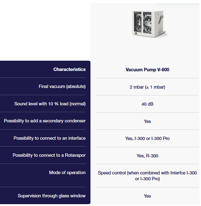 Vacuum capacity: 1.8 m3/h (V-300), 3.4 m3/h (V-600)
