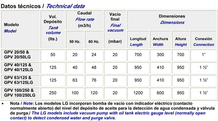 - Oil lubricated vanes vacuum pump of 20, 40, 63 or 100 m3/h.