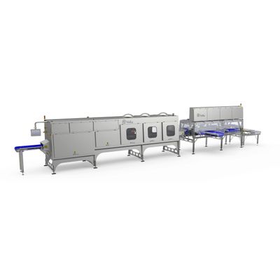 Automatically remove pin bones and cut fillets to the desired portions with the Valka Cutter. Using a combination of an X-Ray and 3D image processing systems together with robot controlled water jets the cutter portions with precision and locates and cuts pin bones. Because the system accurately analyzes each fillet it is able to cut highly uniform portions in relation to size, weight and thickness according to your specifications. With the ability to define multiple cutting patterns and programs different sizes of fillets can be cut into different patterns.