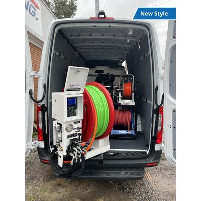 The fully redesigned van pack reaches a new level of compactness without compromising power. The same industry favorite 4000PSI at 18GPM model is outfitted with a 150 gallon water tank and pivoting power pull out hose reel with a full 500’ of ½” high pressure hose. In addition to the main hose reel, the condensed jetting package also includes a mini reel and an electric inlet garden hose reel. This compact jetting unit has all the same bells and whistles as a trailer jetter including the run-dry pump and diesel engine but can fit in most standard high roof vans including Transit, Sprinter, and ProMaster. The van pack is also available with pressures of 3,000 – 4,000 PSI and flows of 8 – 18 GPM.