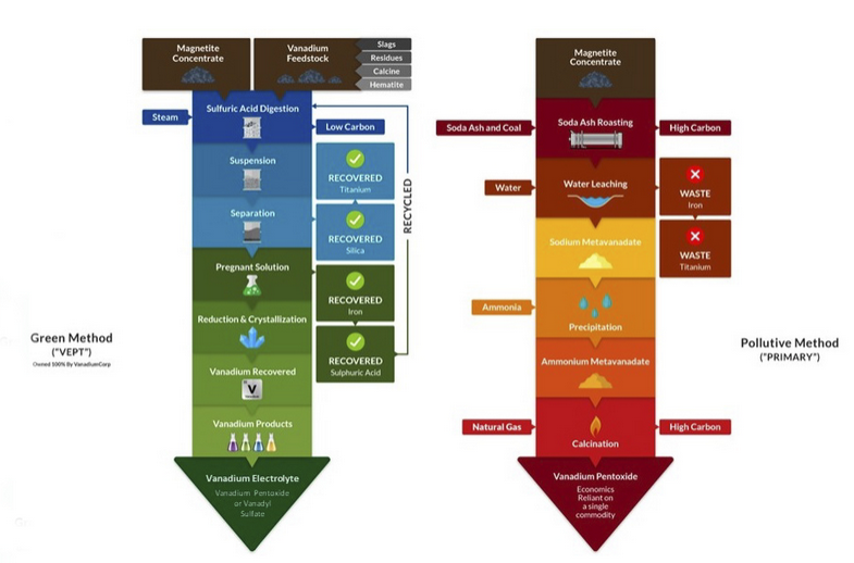 The VEPT addresses these key issues and allows the full recovery of vanadium to produce vanadium electrolyte (VE) or vanadium chemicals, as well as the concurrent production of titanium by-product, high quality, and competitive iron co-product and silica. The 100% owned VEPT is a novel chemical process, invented by Dr. Francois Cardarelli, that consists of digesting vanadiferous feedstocks into concentrated sulfuric acid. The technology addresses the recovery of vanadium pentoxide, vanadyl sulfate, ferrous sulfate, titanium hydrolysate, and silica from feedstocks such as vanadiferous titano-magnetite, iron ores and concentrates such as magnetite and hematite, vanadium industrial wastes such as BOF-slags, and other industrial by-products also containing vanadium.