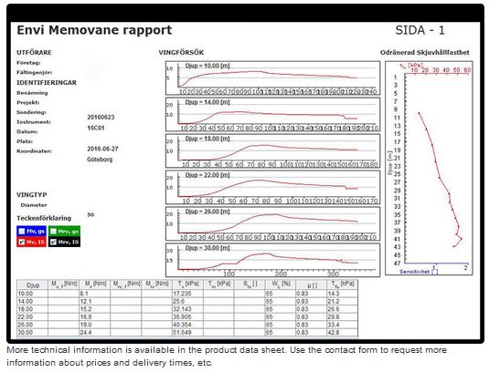 You can run the system as a traditional vane system with torque measurement above ground, but you can (and should) also use the probe that we call Memovane™ for measuring torque directly on the vane without friction losses. After completing a vane tests in one hole you can create a file with resulting data. The system also creates a report with graphs showing measured torque at failure and a table of shear strength and sensitivity etc: