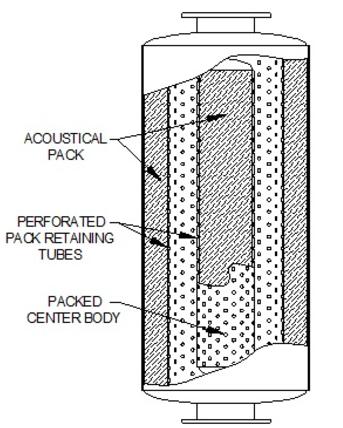 Intended primarily for reduction of higher sound frequencies, VANEC absorptive silencers are often employed in engine air intake lines, particularly when turbochargers are employed. Noise is absorbed within the acoustical packing materials, such as Continuous Strand Fiberglass. Other available materials can include stainless steel mesh, polyester, and mineral wool. Performance can be optimized through adjustments in packing thickness, density, packed length, internal design, and choice of absorptive material. This silencer design offers low pressure drops to preserve engine performance.