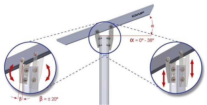 With our patented, multi- statically tested Vario angle-adjustment system, both S and C mounting piles can be chosen. The angle-adjustment system is fixed with only 6 bolts. Our cross beams are individually adapted to each module layout. The advantage here is that the loads are distributed evenly across the entire frame design. Besides, it is also possible to further stabilize the cross beams to avoid excessive vibrations in the case of weather storms. The system is suitable for both framed and frameless modules.