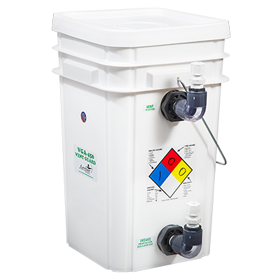 The Archer Instruments VGA-450 Vent Guard is an efficient solution for controlling chlorine gas emissions. It is engineered to absorb up to 3 pounds of chlorine gas that might escape from a chlorine vacuum regulator relief connection. This prevents unnecessary detection alarms, reduces corrosion risks within chlorine handling facilities, and aids in compliance with regulatory standards concerning chlorine gas exhaust. The system operates within a compact container, roughly the size of a five-gallon bucket, housing a non-hazardous chlorine-absorbing medium. The design supports the stacking of units for increased absorption capacity. It features transparent connectors for visual status checks using chlorine indicating paper strips. With tamper-resistant lids and flexible tubing, the VGA-450 ensures simple integration into existing facilities and requires no special disposal procedures. This system is ideal for urban environments or densely populated areas where even small chlorine leaks are a concern.