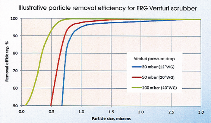 The gas pressure drop determines the particulate removal efficiency. The smaller the particulate, the larger the pressure drop required. Indicative performance is shown in the graph below: