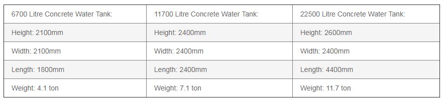 Water Storage Tanks For Domestic, Commercial Or Industrial Use. Underground or inground water storage tanks comes in 3 main sizes: 6700 litres, 11700 litres, and 22500 litres.