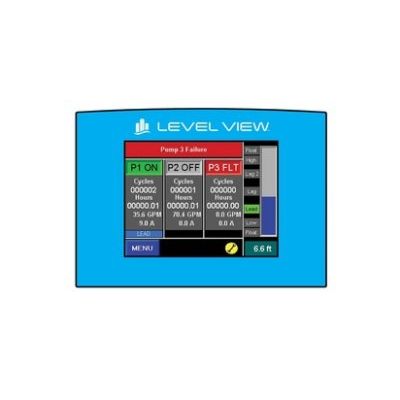 The Level View is a versatile controller that controls two or three pumps. The pumps can be constant or variable speed and pump up (water) and pump down (wastewater) control modes are supported. The sunlight readable color touch screen HMI has the ability to provide on/off level and speed control, pump alternation, flow monitoring, data logging, alarm logging and historical trending. It comes equipped with an SD memory card for data storage and download. Connectivity options provide flexibility for SCADA/BAC automation and a plug and play Pump Watch™ interface. UL/cUL Listed.