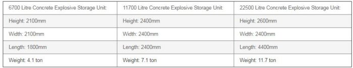 Dangerous goods concrete storage tanks, explosive storage units, and magazines are square or rectangular and are available in 3 sizes: