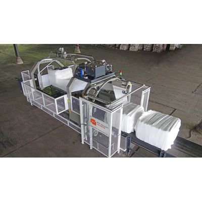 At BERA waste bales composed of shredded plastic are wrapped in preparation to be loaded on a ship. The square bale wrapper of the series Rotowrap WR4+4 is the best solution for wrapping square bales of very hard to process waste material of various dimensions and weights.