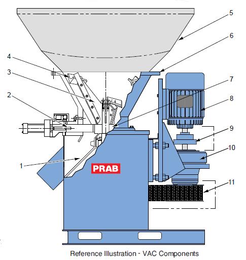 Metal turnings are fed into the VAC’s feed hopper (illust. item 5) which directs the material down into the crusher’s cast alloy hopper (illust. item 6). Fixed cast cutters (illust. item 4) and rotating feeder arm (illust. item 3) reduce the turnings into small pieces. Final crushing is done within the fixed cutting ring (illust. item 7) located in the base of the unit.