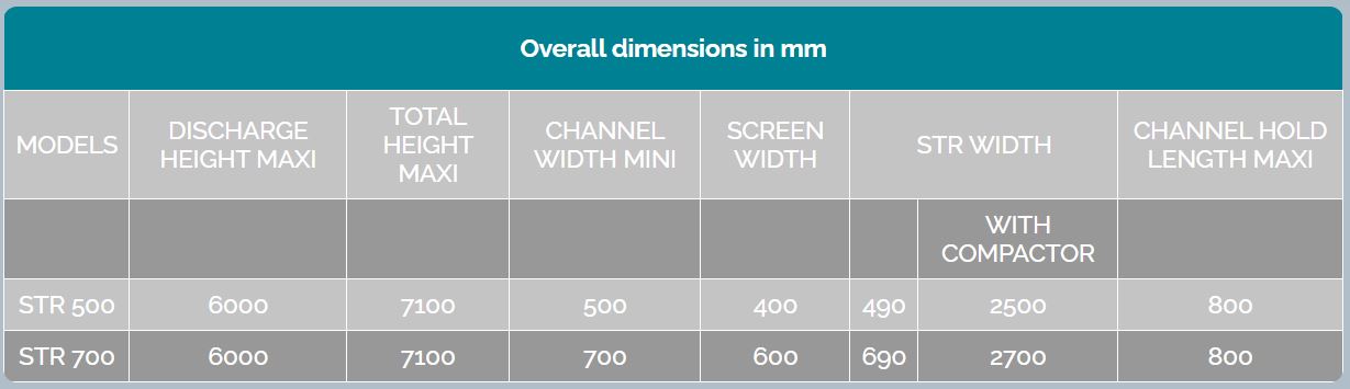 Envirostrap vertical screens, STR series, can be installed in channels or in pumping stations. They fulfill both fine or coarse screening function. They can also be equipped with a fully integrated compactor for screenings dewatering (STR/P series). The effluent passes through the screen, while the waste is stopped by vertical bars spaced apart according to the desired mesh. The screen start-up is programmed periodically, and by loss of head measurement caused by the accumulation of waste on the bars. The waste is lifted by means of a rake going alternatively upward and downward. Driving of the rake is ensured by a strap.