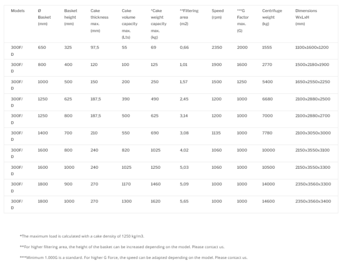 The RINA Serie 300 models are vertical batch centrifuges with automatic discharge (bottom discharge peeler centrifuges) dedicated to solid-liquid separation of slurries with high rotating speed (see table below).