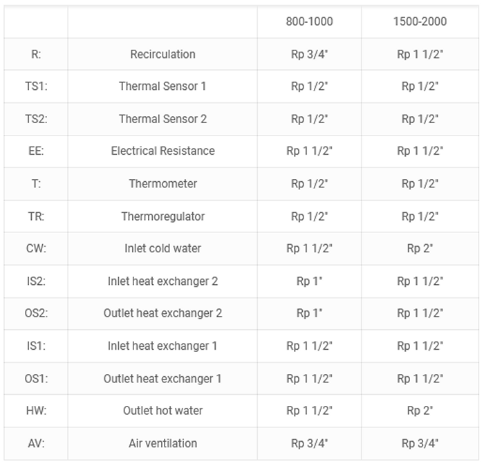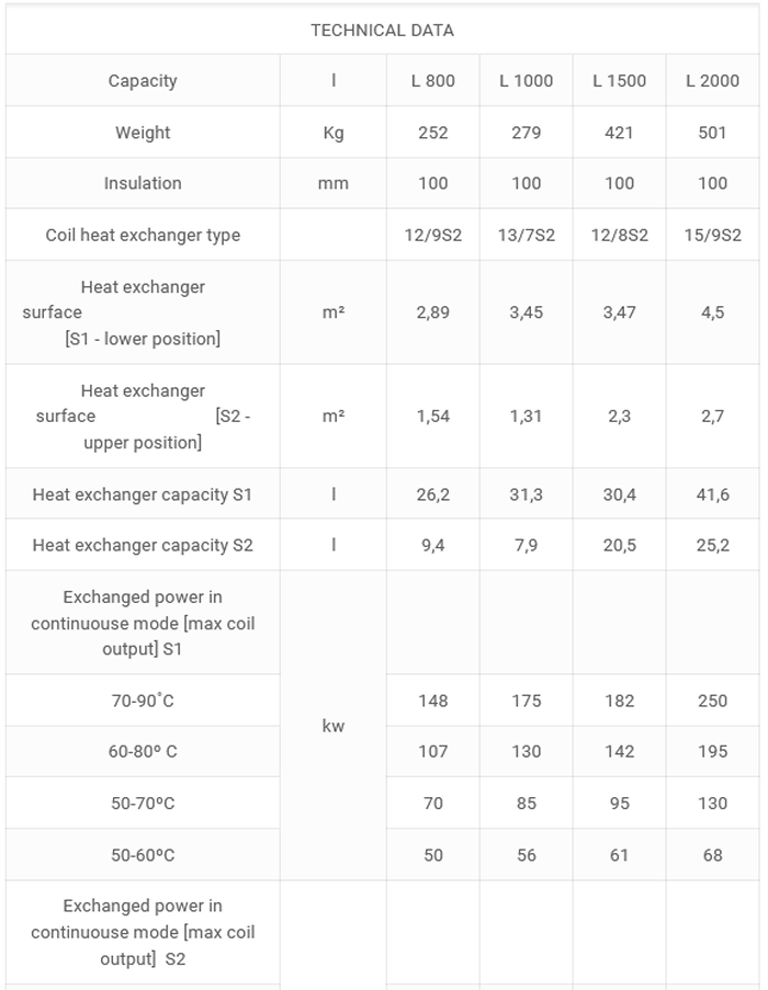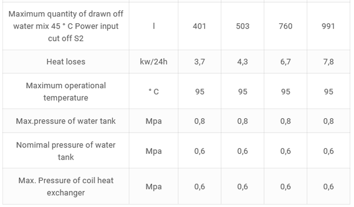 Enameled steel water tank. Highly efficient CFC FREE 50 ?? polyurethane insulation. Anode protection. External Thermoindicator. Safety valve. Pocket for thermosensor. Recirculation connection. Access to the inside of the water tank through easily removable flange. Plastic external cover. Possibility to install heating element.