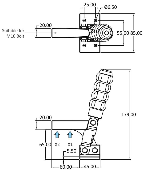 Weight :1.000 kgs; Handle Moves :135o; Bar Opens :80o; Holding Capacity :X1: 4.90 kN; X2: 3.40 kN.