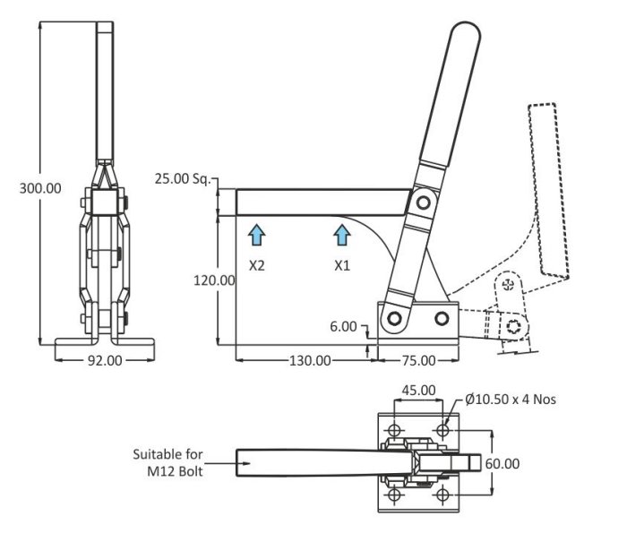 Weight :2.400 kgs; Handle Moves :140o; Bar Opens :85o; Holding Capacity :X1: 9.80 kN; X2: 6.40 kN.