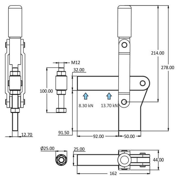 Weight :2.600 kgs; Handle Moves :140o; Bar Opens :125o; Holding Capacity :X1: 13.70 kN; X2: 8.30 kN.