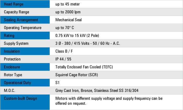 Design Features: Vertical, Centrifugal, Monoblock (unibuilt) type pump fitted with single stage closed Impeller in Volute Casing having In-Line suction and delivery. Can be made available in Close-Coupled design also.