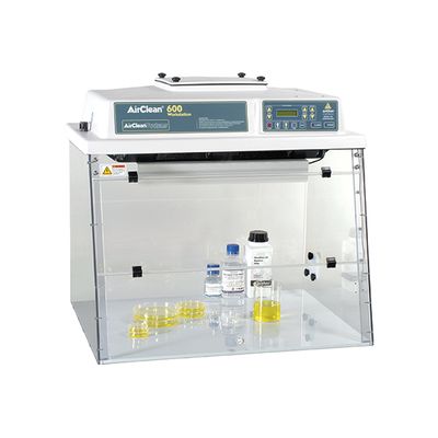 AirClean Systems AC600 Series vertical laminar flow workstations are ideal for applications that are not hazardous to the operator but require a clean work area. The compact, light-weight design allows for multiple "clean zones" within a laboratory. The vertical laminar flow hood provides clean, Class 100 laminar flow air for process protection by utilizing two-stage filtration. Room air first passes through an electrostatically charged pre-filter followed by a HEPA filter resulting in ISO 5 clean air. AirClean Systems vertical laminar flow workstations have been independently certified to meet or exceed applicable clean bench standards.