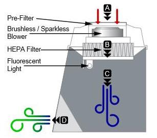 B Air then moves downward through the HEPA filter.