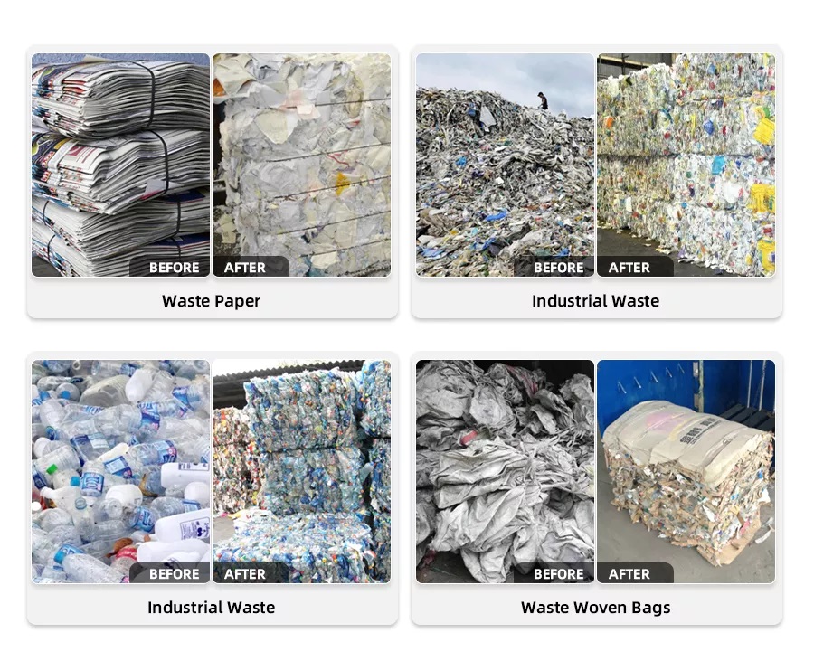 Vertical Balers are used for baling recyclable material(waste paper,cardboard,carton box,OCC,pet bottles,plastic bottles,waste tyre,used cloth) into solid, space saving blocks. This reduces the space needed for waste storage, reduces the cost of waste collection and reduces the time spent on disposing of waste effectively and responsibly.