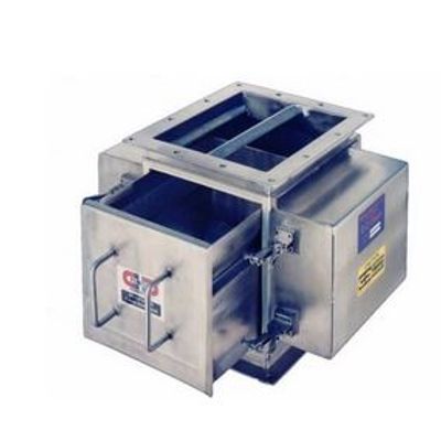 Cleaning is achieved by releasing the latch assembly and pulling the drawer open. As the drawer is opened the magnets remain in a stationary position. Ferrous contaminants are transferred outside the product flow area where they are safely discarded. A specially designed angled drawer end ensures all contaminants are released outside of the product flow area. As product enters the stainless steel housing, it is diverted towards two very large and powerful magnets that oppose each other. A Single Trap face design eliminates the possibility of contamination washoff.
