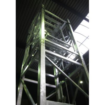 This vertical transportation system is equipped for max. 1500 kg loading and with a capacity of 30 cycles per hour. It was completely galvanized, including the roller conveyors for the in- and outfeed.