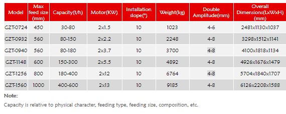 GZT series vibrating feeder uses vibrating motor to produce vibration force. It is used to feed materials into primary crusher homogeneously. Because of the bar-shaped screen, it can increase primary crushing capacity through filtering out filter out soil contained in raw materials. It is widely used in hydropower, building material and mining industries.