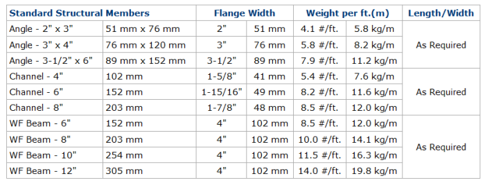 - Frame members include WF beams, Channels, Angles, and I-beams