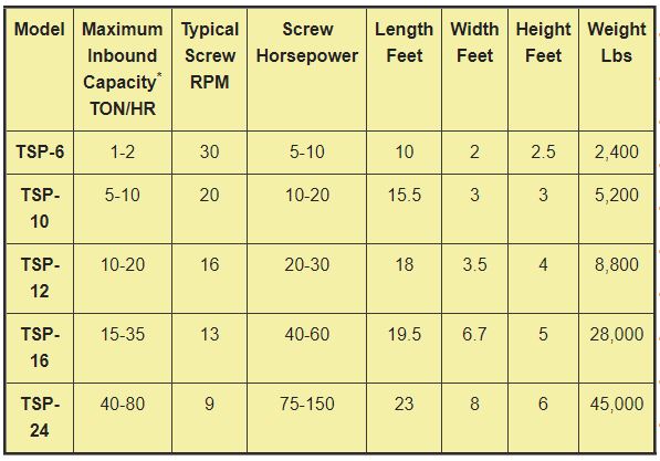 The TSP Series Screw Presses have two overlapping screws. They are available with 6″ and larger screw diameters. They are best suited for applications involving very slippery material, those materials which require internal shredding, or installations requiring extraordinarily high throughput capacity. Because of their cost and complexity, they are not used where a single screw press can do the job.