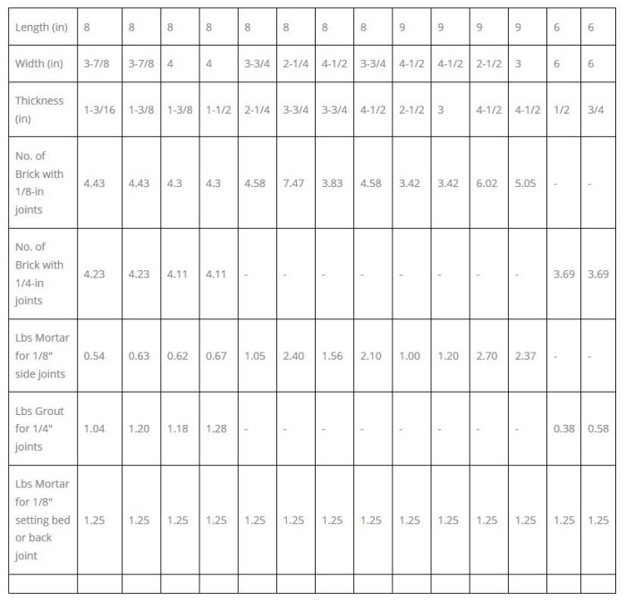 The above quantity requirements are based upon physical dimensions of chemical-resistant masonry units and actual weight of mortar as determined by ASTM C-905. Actual usage rate will vary dependent upon scope of installation, experience of workmen, field conditions and other contingencies. Personnel using the above chart should, therefore, add an appropriate wastage factor.