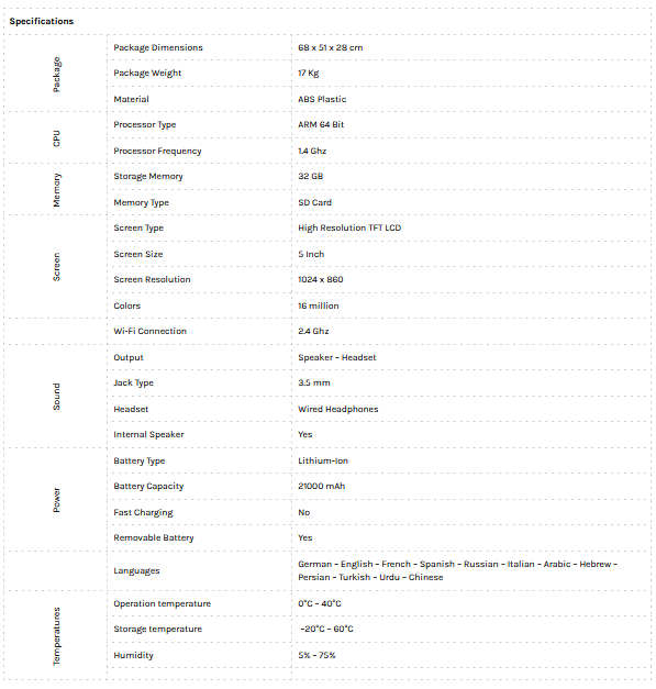 Operated via an external lithium-polymer battery located in a distinctive designed plastic box for better portability and replacement, the battery can be recharged and guarantee a long period of operation time.