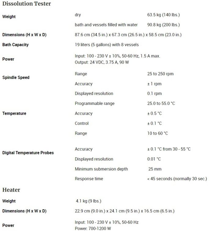 - No tools or adjustments needed to switch among USP App. 1, 2, 5, 6, and 150 mL and 250 mL small volumes