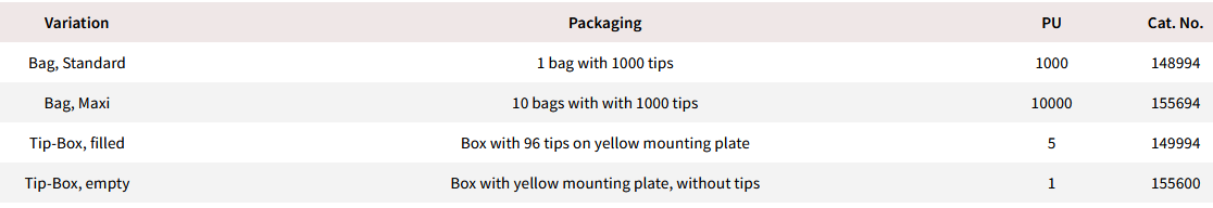 PP, non-sterile with graduation at 20 and 100 μl. Length: 50 mm. Tip-Box with yellow mounting plate for easy identification; palletized tips are colourless. Tips in bags are coloured yellow.