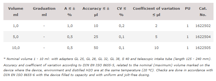 The dispenser are equipped with a positive displacement piston and a fluoroplastic (PFA) sealing lip on the cylinder wall. This latter acts like a windscreen wiper to prevent crystal build-up on the cylinder wall from readily crystallisable media. The glass cylinder is also coated with a plastic material that reduces the risk of splashes should breakage occur. The telescopic filling tube can be adjusted smoothly to different bottle heights.