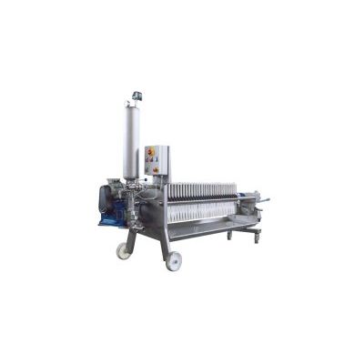Filter press with leaning plates LFA 400×400. Standard version in stainless steel AISI 304 on wheels featuring: Fixed plate complete with inlet pipe with ball valve connected to the feeding pump installed on board and outlet pipe with sight glass and ball valve.