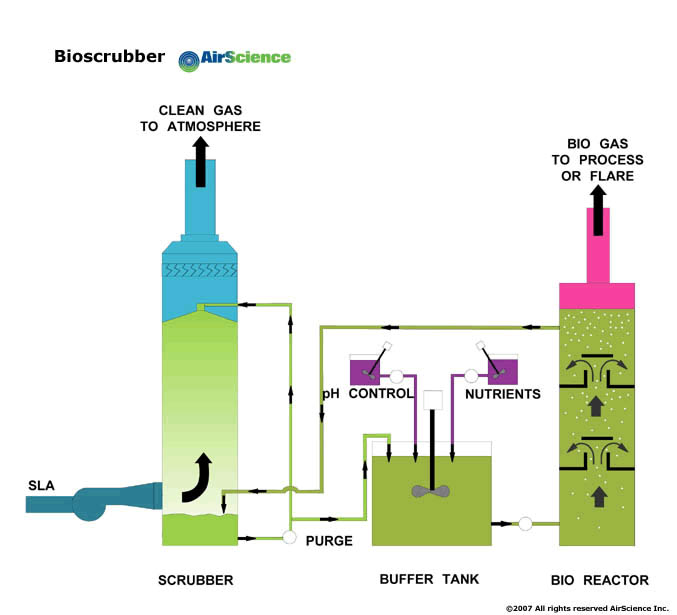In AirScience`s Bioscrubbers, the polluting compounds are first absorbed or dissolved in a water scrubber. The resulting liquid solution is then transferred to a bioreactor where microorganisms degrade the dissolved organic compounds in an anaerobic condition. The resulting bio-gas consists primarily of methane, which can be used as process fuel. Capture efficiencies are in excess of 95%. Anaerobic bioscrubbers have the advantage of generating a fraction of the biomass generally produced in aerobic bioscrubbers. They are most effective for applications where alcohols are the predominant compound. Also, bioscrubbers are the most compact of all biological gas cleaning systems.