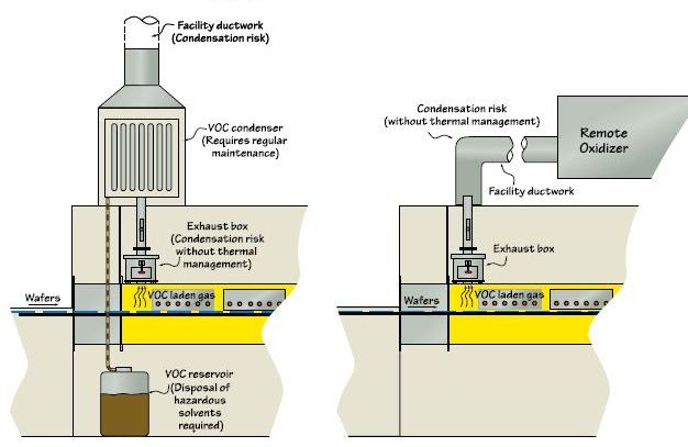 Other VOC abatement options are ineffective and require extensive maintenance. Condensers require containment and removal of hazardous solvents and regular cleaning. With remote facility abatement systems, solvents condense in the ductwork requiring extensive cleaning and creating a fire hazard.