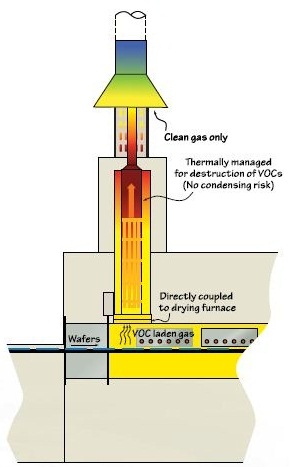 The solar cell manufacturing process creates unwanted environmental pollutants which are byproducts of the drying process, and contain the non metallic ingredients found in the paste material such as ethanol, Texanol and terpineol. These pollutants can condense inside facility ductwork and create hazardous conditions. Destroying the VOCs using the Oxidizer eliminates the need to collect and dispose of this waste in a separate process. The exhaust exiting from the VOC Oxidizer contains only CO2 and water vapor.