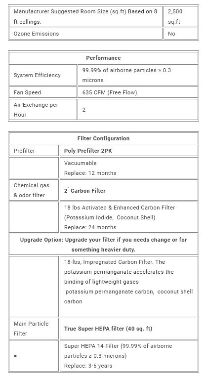 - 18-lb enhanced carbon filter adsorbs most common VOC's and harmful, airborne chemicals and pollutants.