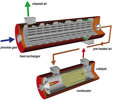 The gaseous stream containing V.O.C. is preheated passing through the shell and tube heat exchanger up to a temperature close to 200 ÷ 270 °C by mean of the heat released by combustion gases which pass through the shell side of the same heat exchanger, and after passes through the combustion chamber where the modulating burner, which is normally fed with natural gas, supplies the amount of energy needed to reach and keep constant the temperature at which the complet catalytic oxidation of V.O.C. occurs, 300 ÷ 450 °C, passes through the catalyst bed, where the catalytic oxidation reaction occurs and finally releases the absorbed heat, passing through the shell side of the heat exchanger, cooling itself down to a temperature bigger than the inlet one of 150 ÷ 200 °C and is emitted cleaned to atmosphere.